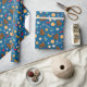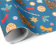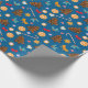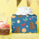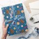 Papel de enrolar com um padrão de Ano Novo, fotos fofinhas de doces, lábios e biscoitos, arcos e folhas de pão de gengibre em fundo azul.