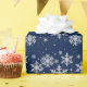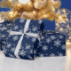 Papel de envolvimento elegante do feriado feito em azul escuro, com os gráficos dos flocos de neve de prata do brilho. Grande papel do Natal com para fora a confusão do brilho. Personalize para adicionar seu próprio texto.