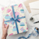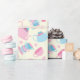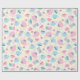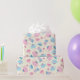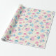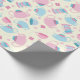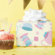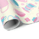 Uma mistura de bules e do indivíduo & de pilhas azuis e cor-de-rosa de teacups entre o rosa do rosa floresce e borboletas cor-de-rosa sobre um fundo amarelo pálido.