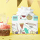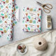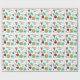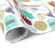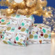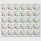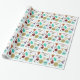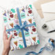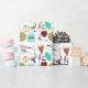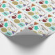 Papel de envolvimento que caracteriza um teste padrão temático da torta com ilustrações de um fogão, de uma fruta, de uns utensílios da cozinha, e de umas tortas.