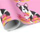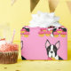 Lunático e divertimento Boston Terrier com papel de envolvimento dos cupcakes