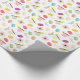 Papel de envolvimento que caracteriza um teste padrão temático da comida francesa dos macarons, dos teacups, das flores da anêmona, e do "Bonjour!"