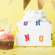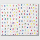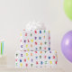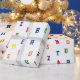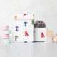 Design apresenta o alfabeto padronizado em letras brilhantes e coloridas de estêncil sobre um fundo branco. Projetado para coordenar com a "Coleção de Chás de fraldas ABC".