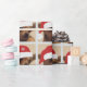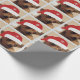 Chihuahua bonitinho com o chapéu de Papai Noel embrulhando papel.