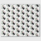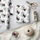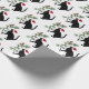 Um gato preto vestindo um Papai Noel que segura um galho verde com um pássaro cardeal vermelho neste papel de embrulho de férias.