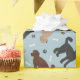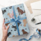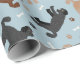 Labradodles bonitos em casacos castanhos, pretos e bronzeados, sentados, sentados e deitados com ossos de cão espalhados e estampas de pata sobre fundo azul.