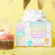 Um padrão divertido e brilhante de diferentes tipos de bolos de aniversário arco-íris, balões e confete.