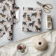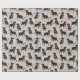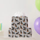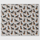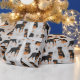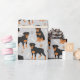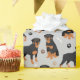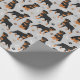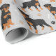 Cães girassóis bonitos sentam-se e ficam de pé com casacos pretas e bronzeadas com ossos de cão espalhados e padrões de pegadas.