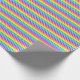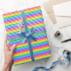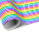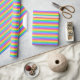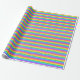 Um papel de embalagem projetado com um padrão listrado com cores brilhantes do arco-íris e branco em largura fina.