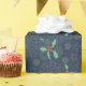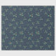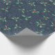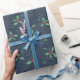Papel de regalo con copos de nieve y hojas de acebo sobre fondo azul oscuro.