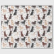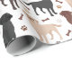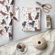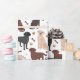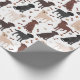 Cães de Collie Rough Cute sentam-se e ficam de pé e rollover com casacos sápidos, tricolores, unidos e brancos com ossos de cão espalhados e padrões de pegadas.