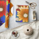 Um papel floral caleidoscópico, vivo, com margaridas sobredimensionadas em tons vívidos de vermelho, laranja, azul, roxo e verde. Confrontadas com detalhes semelhantes aos da costura do ouro, as flores criam um efeito texturizado bordado à mão que parece festivo e artístico. Perfeito para aniversários, comemorações de primavera, ou qualquer pessoa que pense sutileza é supervalorizada.