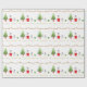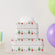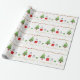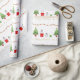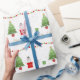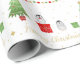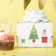 Um papel festivo de embrulho de Natal com pinguins de bebê, árvore de Natal, presentes e estrelas embrulhados. Natalie Kinnear Designs