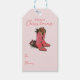 Este slogan de presente To/From, apresenta um par desenhado à mão de botas de natal de vaquinha sentadas entre pinecones, pínus e bagas ocas na frente. A parte de trás apresenta um padrão divertido com estes mesmos elementos ocidentais. Fundo rosa macio legante.