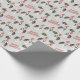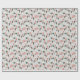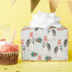 Um lindo Cachorro Siberiano veste um chapéu de Papai Noel listrado vermelho e branco no padrão deste papel de embrulho de Natal. Junto com as imagens do cão, estão borras verdes e sprigs com bagas vermelhas, e texto vermelho que diz "Feliz Natal". As imagens e o texto são colocados sobre um fundo de cinza prateada.