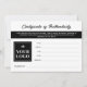 Certificado de autenticidade personalizado moderno com um script de assinatura moderno e fontes minimalistas. Assine manualmente e adicione título, meio, dimensões, data etc. juntamente com o seu logotipo ou uma foto do trabalho de arte. Certificado de autenticidade unilateral com fontes modernas, seu logotipo em um fundo branco e sua isenção de responsabilidade e texto de direitos autorais personalizados em branco contra preto. O certificado de autenticidade do seu trabalho de arte para que seus clientes e clientes saibam que o trabalho de arte que adquiriram é um original no qual você pode gravar manualmente os detalhes antes de assinar manualmente.