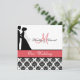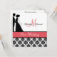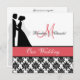 Impressão preto e branco do damasco com uma banda coral, uns noivos da silhueta, e áreas que você pode personalizar com seus nomes, inicial do monograma, cerimónia de casamento e informação da recepção em um convite wedding personalizado que seja elegante e tradicional tudo em um!