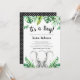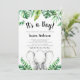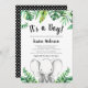 Design adorável do convite do chá de fraldas do elefante do menino que caracteriza as folhas tropicais da aguarela, o elefante do bebê e o teste padrão de bolinhas preto.