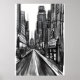 Arte preta e branca de uma rua urbana com prédios altos em ambos os lados, você pode ver um carro na rua. Esta é uma arte gerada por IA.