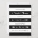 Um convite de chá de casamento Bridal, branco e preto, contendo um ponto para a noiva e monogramas noivos e informações relevantes sobre o seu evento dentro de faixas horizontais.