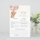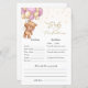 Cartão de Aviso e Previsão para Bebês. Este design apresenta um urso de pelúcia amigável com balões cor-de-rosa e creme. O texto "Predicções do Bebê" está escrito em fontes modernas de caligrafia. Adicione suas previsões sobre o novo bebê e deixe seus melhores desejos.