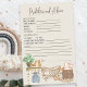 Predições e folhas de Chá de fraldas de Aconselhamento com ilustração bétula de berçário de ursos, roupas de bebê, berço e brinquedos de madeira. Este chá de fraldas boêmico rústico tem uma design de aquarela neutra do gênero em tons naturais de terra e cores mutadas. Por favor, navegue na minha loja da coleção Boho Baby Nursery para obter itens correspondentes ou me mande mensagem para adicionar os itens adicionais de que você precisa. Um doce design para uma menina ou um chá de fraldas de bebê.
