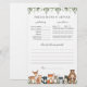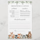 Os animais florestais têm o tema predições de chás de fraldas e cartão de jogo de aconselhamento, com uma ilustração de animais de madeira de cor d'água e uma cor verde-d'água eucalipto garland e uma elegante letra de estilo manuscrito.