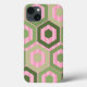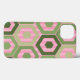 Essa capa de telefone tem um design geométrico de hexágonos em quatro tons de verde em um campo de listras rosa em dois tons.