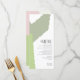 Bloqueio de cor abstrato em uma paleta colorida de cor rosa cor rosa e primavera verde fornece um fundo impressionante para as peças desta suíte de casamento contemporânea. O cartão 'Menu' do casamento mostrado aqui é uma adição chamativa à sua decoração de mesa. Adicione as seleções de menu, as iniciais e a data do casamento usando a modelo fornecida. Procure ID740 para ver outras opções de cores e produtos adicionais com este design.