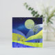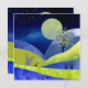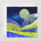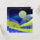 Uma paisagem de abstrato que representa colinas rolantes com primavera e plantas florescentes e uma lua e estrelas em tons de azul, ciano, amarelo e rosa.