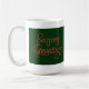 Crie uma herança familiar única quando você adicionar sua foto a esta caneca adorável com uma armação listrada de cana doce em vermelho e verde amarrada com uma fita vermelha de cetim. O fundo é verde festivo com espaço para personalização. O lado esquerdo tem a saudação tradicional de Natal.