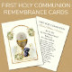 Personalize o nosso lindo e tradicional Cartão de Memória da Primeira Comunhão Católica com um cálice de ouro com as flores Eucaristas e brancas. A bela oração à Anima Christi católica está nas costas. Todo texto e fontes podem ser modificados.