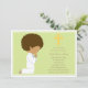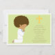 O convite da Primeira Comunhão Verde, com um rapaz afro-americano ajoelhado à esquerda, cruz amarela com detalhes da Comunhão ou do partido à direita em marrom.