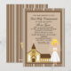 Comece a comemorar com este adorável convite para as meninas especiais Primeira Comunhão Sagrada. Tem uma borda listrada castanha clara e escura. no centro há um centro bronzeado com uma borda branca ao redor dele Há uma garota adorável vestindo um vestido de comunhão branco com um véu. Ela tem cabelo loiro. Ao lado dela está uma bela igreja. Convidamos para celebrar o dia especial dela. Veja os muitos outros itens nesta linha, como etiquetas, postagens, notas de agradecimento e muito mais.
