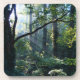 Brilhantes raios brancos do sol matinal, que passam por trás de galhos escuros para uma rica floresta verde de verão, com árvores maciças cobertas de mariposa e mato fértil.