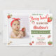 Convite de primeiro aniversario de morango com foto Convite de aniversário de Morango de Morango convite de Berry para primeira festa de aniversário. Convide seus amigos com este convite para o tema do morango de aquarela fofo! Este convite para o aniversário de uma menina apresenta grandes morangos vermelhos e várias flores. Basta editar este modelo fácil de usar no menu Personalização para torná-lo especial.