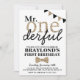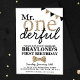 Este Primeiro Aniversário, Sr. Onemagnificy Invitation, apresenta um design de brilho preto e dourado. Este convite será perfeito para o seu homenzinho no seu primeiro aniversário.