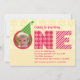 Um convite de primeiro aniversário moderno e impressionante. Apresenta a palavra "UM" em letras grandes com padrões mistos. Adicione a imagem do seu filho dentro a letra "O" para um toque pessoal. O chapéu da festa sobre as fotos adiciona um toque divertido. Um convite bonito e colorido ideal para celebrar este importante aniversário.