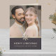 Capture o encantamento da sua primeira temporada de festas como recém-casados com este cartão com fotos dobrado espantoso. A frente mostra uma foto cativante de vocês dois em sua roupa de casamento, irradiando amor e alegria. Uma faixa escura adornada com as palavras "Feliz Natal" e texto personalizável cria um pano de fundo elegante contra o interior claro. Adicione uma mensagem sincera e sua assinatura de script para transmitir desejos calorosos aos seus entes queridos. O dorso apresenta um fundo escuro que complementa o espírito festivo, com um pequeno floco de neve nos terços inferiores acrescentando um toque charmoso. Este cartão personalizável é a maneira perfeita de compartilhar sua alegria e amor durante esta época mágica do ano.