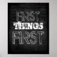 Primeiras coisas, a primeira citação de poster tem um texto no estilo do chique branco sobre carvões escuros em aflição, cinza de fundo, para decoração em casa ou no escritório.