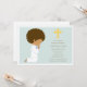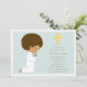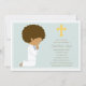 Do azul convite do comunhão santamente primeiramente que caracteriza um menino de ajoelhamento do afro-americano na cruz esquerda, amarela com comunhão ou detalhes do partido no direito no marrom.