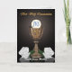 Imagem e ilustração da composição do cálice de ouro sobre rosas brancas e pretas e texto para o Primeiro convite de festas da Comunhão Infantil