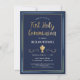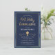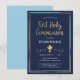 Este convite da Primeira Comunhão, moderno e clássico, apresenta um cálice de ouro ilustrado, uma fronteira azul, verde e dourada, e as palavras "Primeira Comunhão" em ouro (simulação de detalhes das folhas). O plano de fundo é uma cor azul marinho, mas pode ser personalizado para qualquer cor que você escolher. O texto é personalizável para o seu sacramento religioso especial.