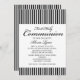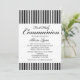 Comece a comemorar com este convite elegante para aquela comunhão especial. Tem preto com listras brancas no topo do convite e na parte inferior. Personalize com suas informações do partido no centro sob a grande palavra "Primeira Comunhão Sagrada" escrita em roteiro. Veja os muitos outros itens nesta linha, como etiquetas, postagens, notas de agradecimento e muito mais.