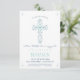 Este convite da Primeira Comunhão moderna apresenta uma elegante cruz floral azul e verde desenhada. Ideal para a celebração religiosa de um menino, pode ser personalizado com o nome do seu filho e os detalhes do evento. A cor de fundo também pode ser alterada para seu gosto.