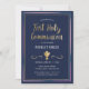 Este convite da Primeira Comunhão, moderna e clássica, apresenta um cálice de ouro ilustrado, uma fronteira azul, rosa, roxa e dourada, e as palavras "Primeira Comunhão Sagrada" em ouro. O plano de fundo é uma cor azul marinho, mas pode ser personalizado para qualquer cor que você escolher. O texto é personalizável para seu sacramento religioso especial.