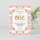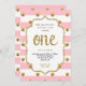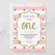 As listras cor-de-rosa e as bolinhas com brilho dourado são apresentadas no primeiro convite de aniversário desta rapariga clássica. Use o formulário modelo para adicionar os detalhes da sua parte. O recurso Personalizar pode ser usado para adicionar texto à parte traseira ou alterar o estilo da fonte.