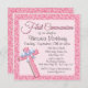Tragam a bexiga e o glamour com este bonito convite de primeira comunhão. Apresenta uma bonito cruz espumante com arco de cetim contra uma rosa claro e fundo branco da Áustria. Ilustração desenhada à mão por McBooboo.