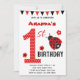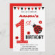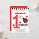 Convite de aniversário com tema de joaninha giro e combinação de cor preta e vermelha.