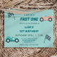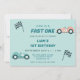 Comece o seu motor e comemore o seu primeiro aniversário com esta festa tematizada do carro de corrida. Este convite apresenta carros de corrida de safra bonitos. Condecorações de festas na nossa loja.